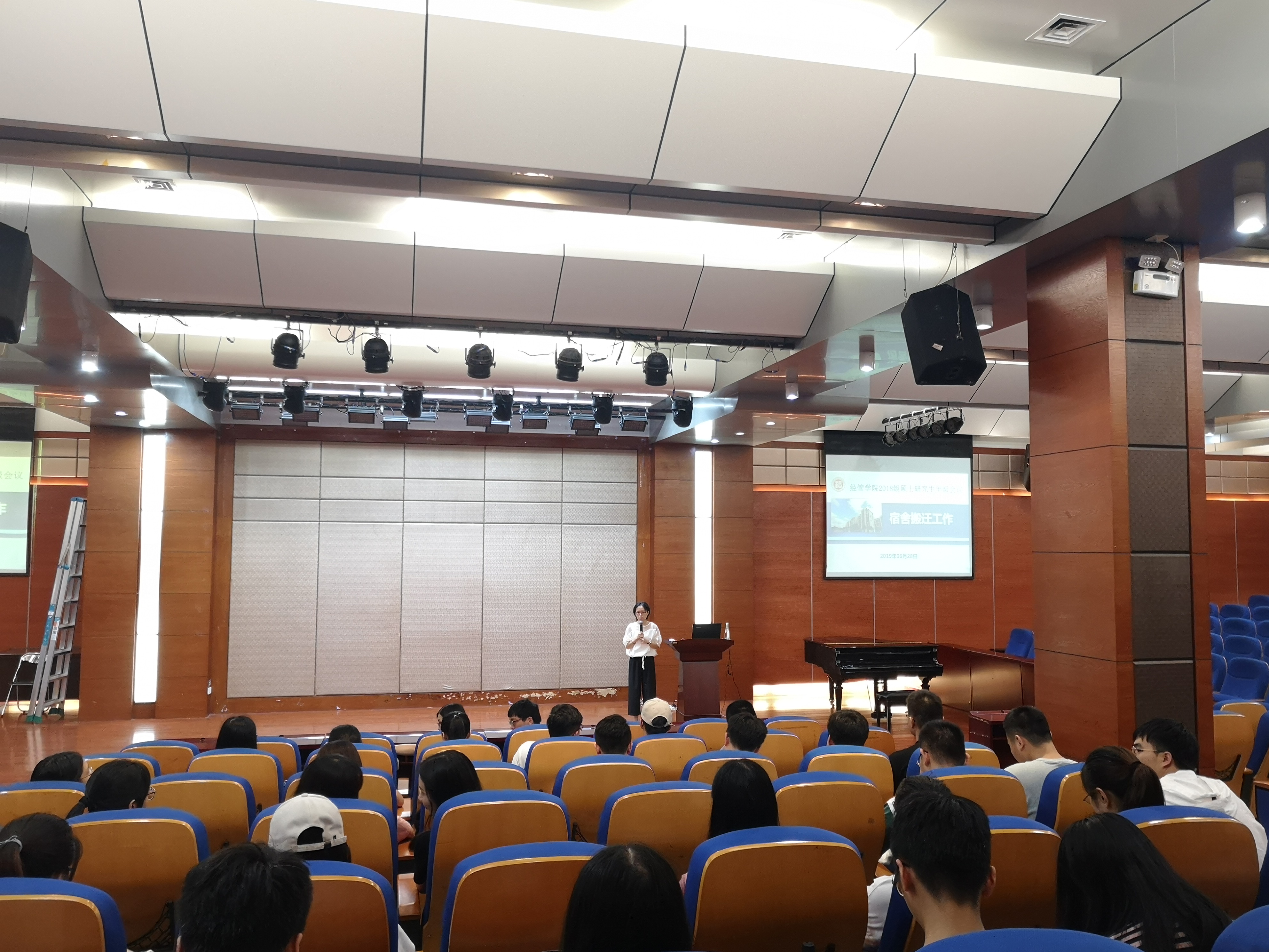 夏丽君老师首先对学习和安全方面的相关事项进行了补充,然后针对即将到来的学硕宿舍搬迁工作进行了讲述。强调了宿舍搬迁的一些注意事项,首先最重要的肯定是安全,人生安全、财产安全都要重视,做好防暑工作,贵重物品随身携带。其次在搬迁中个人物品一定要贴好标签,宿舍内部分好工。最后通过PPT上的手绘校区地图,提前告知车辆位置,把所有准备工作都做好。
